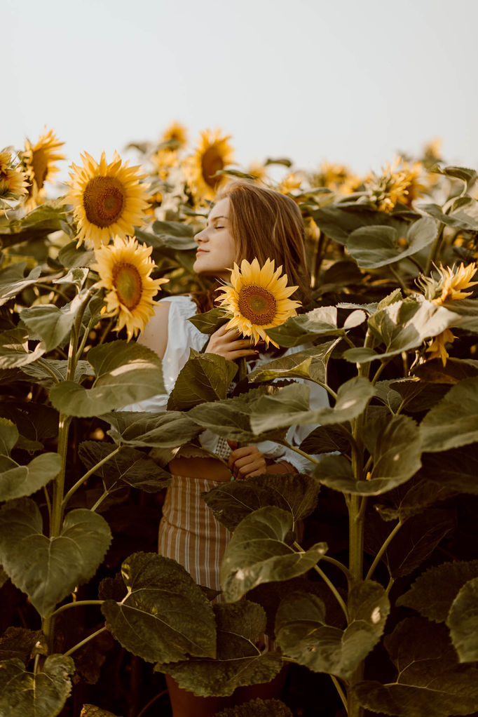 Słońce powoli chyli się ku zachodowi, otulając pole słoneczników ciepłym, złocistym światłem. Miękki wiatr porusza delikatnie płatki kwiatów, a wśród nich – ona. Uśmiechnięta, z włosami muśniętymi letnim powietrzem. Chwila beztroski, cichy śmiech wśród szeleszczących łodyg, spojrzenie pełne marzeń.